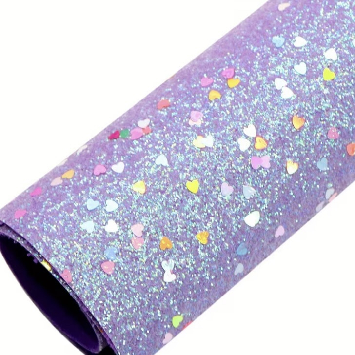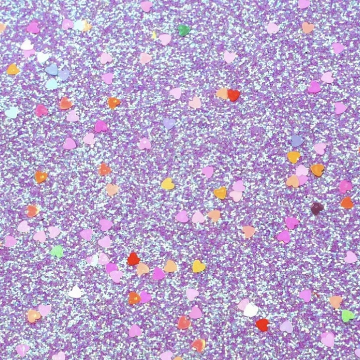 PU leer A4 lapje; glitter met gekleurde hartjes lila. Synthetisch leer voor het maken van haarstrikken, haarclipjes, oorbellen etc. Dikte: dun/gemiddeld.