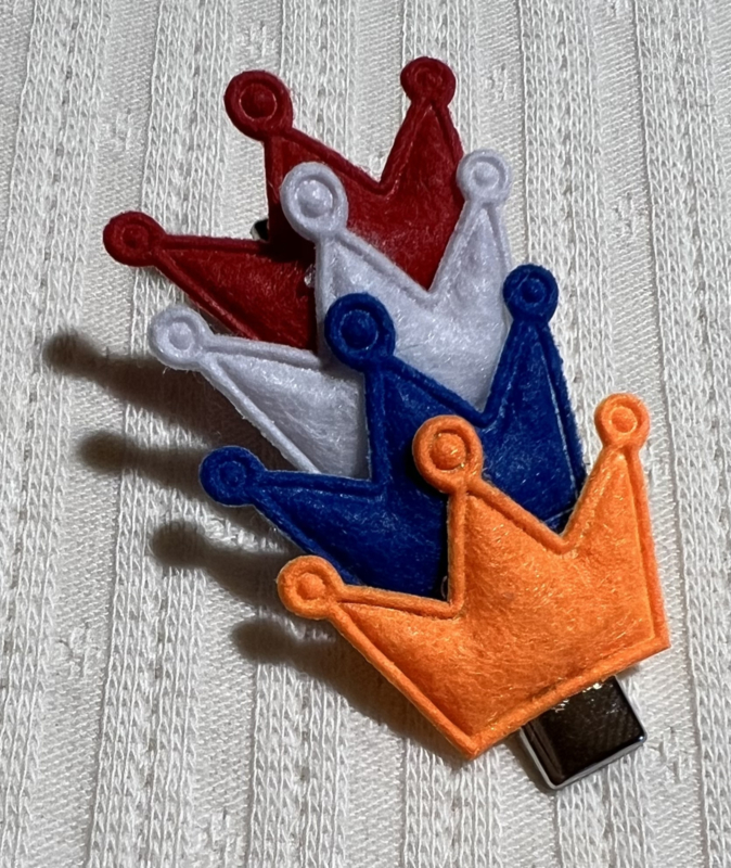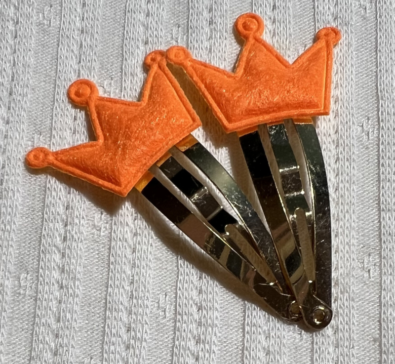 4 cm gouden clipjes met oranje kroontjes4 cm gouden clipjes met oranje kroontjes. Prijs per setje.