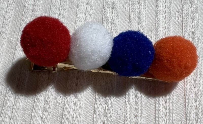 Alligator clip light gold45 mm met pom-poms rood-wit-blauw-oranjeAlligator clip light gold45 mm met pom-poms rood-wit-blauw-oranje. Prijs per setje.