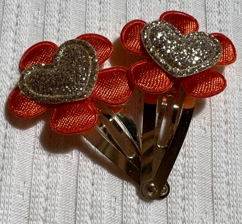 Klik klak haarclipjes 4 cm light gold met oranje bloem en gouden hartKlik klak haarclipjes 4 cm light gold met oranje bloem en gouden hart. Prijs per setje.