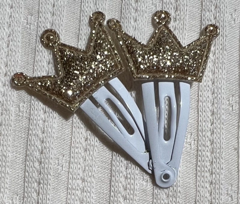 3 cm witte clipjes met gouden kroontjes3 cm witte clipjes met gouden kroontjes. Prijs per setje.